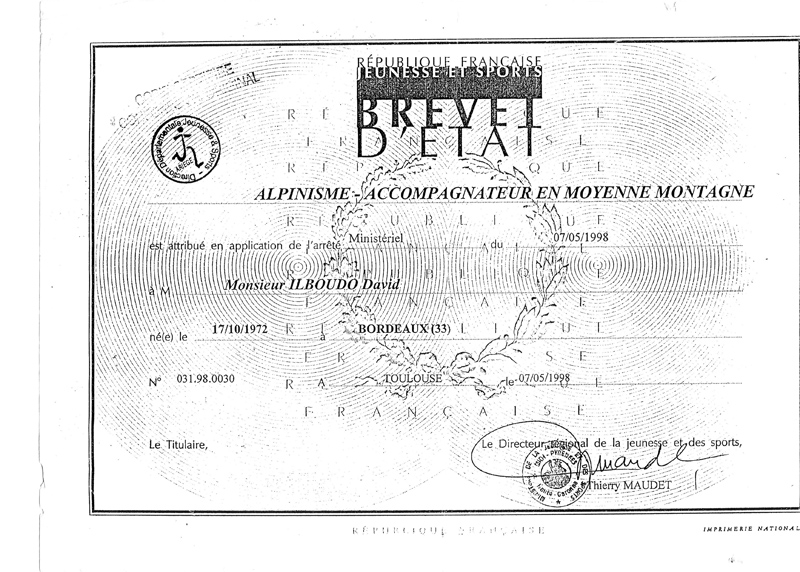 BEES 1er degré Alpinisme Diplôme n° 31.98.0030 délivré le 7 mai 1998